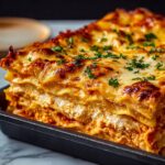 This Buffalo Chicken Lasagna combines the spicy kick of buffalo sauce with the creamy goodness of ricotta and mozzarella cheeses layered between tender lasagna noodles. Perfectly baked to a golden bubbly finish, this hearty dish offers a delicious twist on traditional lasagna with a flavorful buffalo chicken filling. Ideal for a family dinner or a game day feast.