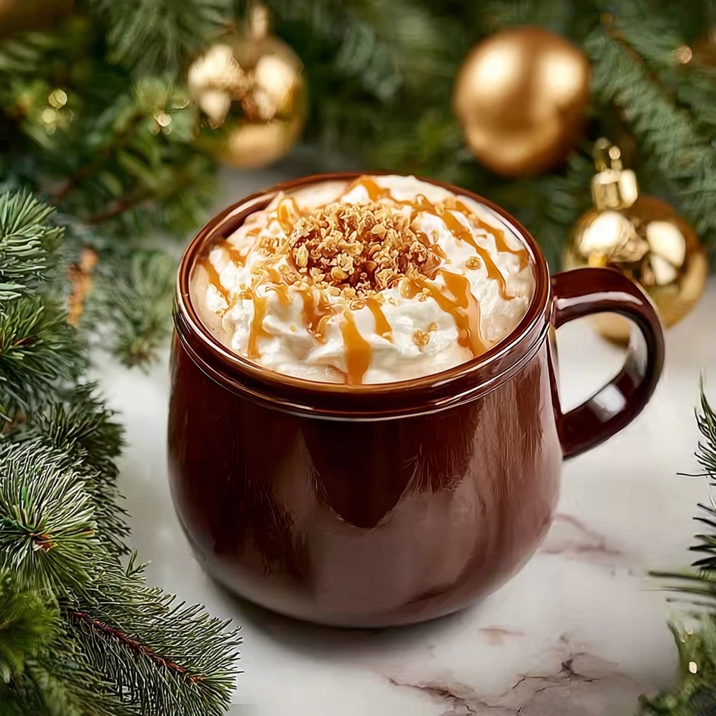 The whipped cream crowned with crushed toffee bits is a classic garnish that adds texture and visual appeal. For an extra festive touch, sprinkle a pinch of cinnamon or nutmeg on top. A drizzle of caramel sauce is the cherry on top that invites one more decadent taste.