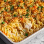 This comforting Chicken Noodle Casserole features tender egg noodles mixed with sautéed vegetables, creamy cheese sauce, diced chicken, and peas, all topped with a buttery Ritz cracker crust and baked to golden perfection. Ideal for a hearty family dinner, this casserole combines classic flavors and creamy textures for a satisfying meal.