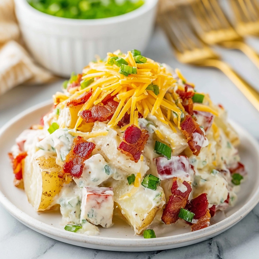 To make your Loaded Baked Potato Salad Recipe look irresistible, sprinkle extra chopped green onions, crumbled bacon bits, and a little extra shredded cheddar cheese on top just before serving. A small dash of smoked paprika can also add a lovely finishing touch and visual appeal.