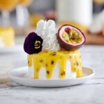 3. Make the Passion Fruit Curd: In a saucepan, combine lemon juice, passion fruit pulp, caster sugar, lemon zest, vegan butter, and sweetened condensed oat milk. Heat gently over medium-low heat while stirring. In a small bowl, mix cornflour and water to create a slurry, then add it to the saucepan. Continue stirring until the mixture thickens into a smooth curd. Remove from heat and allow to cool slightly. Reserve three tablespoons for the topping.
